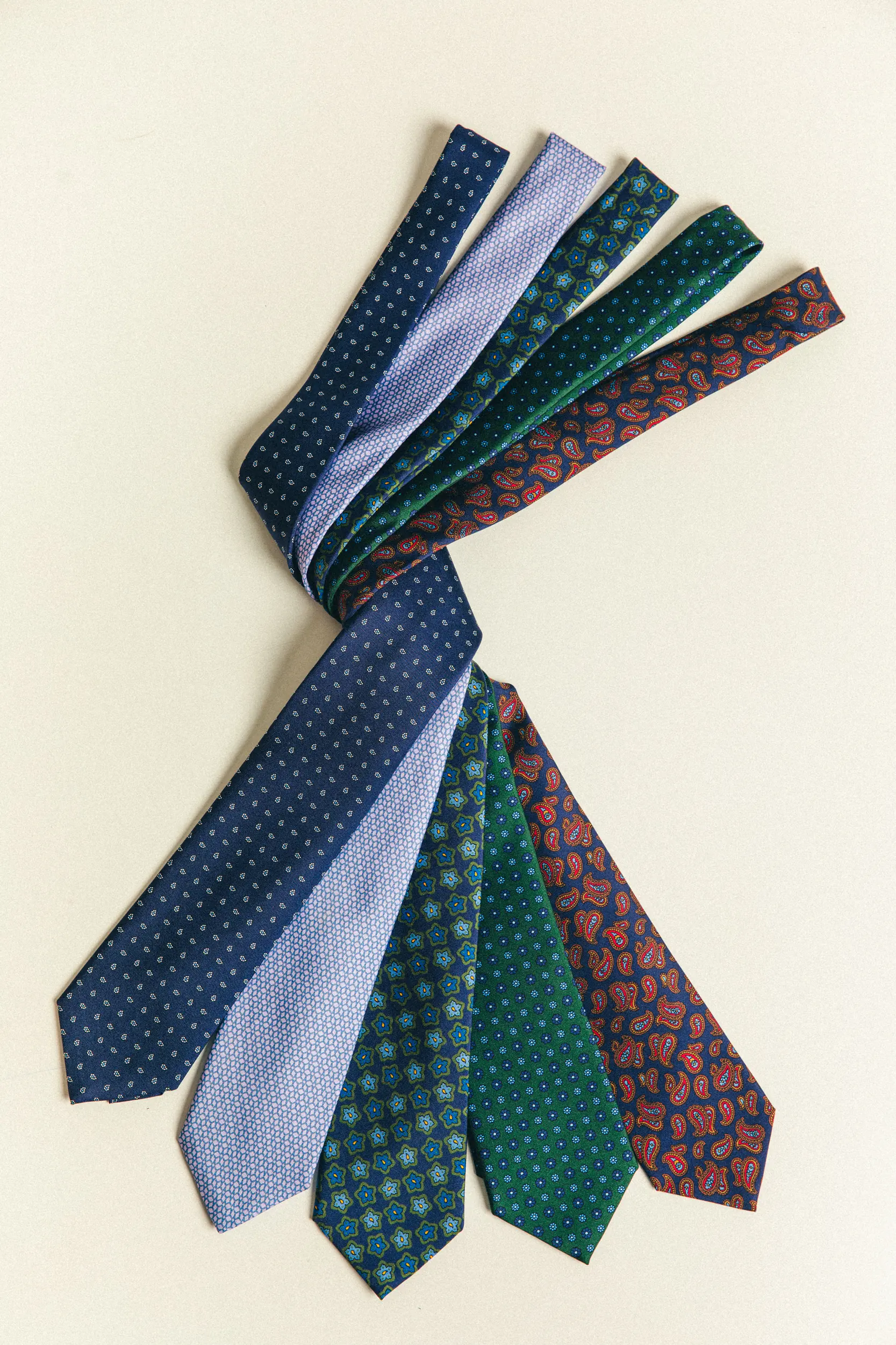 Sete solide, texture discrete, righe regimental e piccoli motivi geometrici comunicano compostezza e chiarezza. Colori come il blu navy, il bordeaux e il grigio antracite rimangono scelte senza tempo per gli ambienti di alto livello.